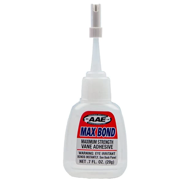 AAE Max Bond glue is specifically formulated for our Max Hunter, Pro Max, Plastifletch (PM) and Max Stealth vanes. Max Bond is a high-viscosity liquid that is easy to work with and penetrates well when using our tough Elastimax material. Whether you are fletching carbon or aluminum, this is the toughest glue available. Use Max Bond on our Max Hunter, Pro Max, Plastifletch Max and Max Stealth vanes. If the vane has MAX in the name you should be using our Max Bond Glue. Max Bond glue also works well with Elite Plastifletch, WAV, and most other plastic vanes. .7 oz (20 grams)