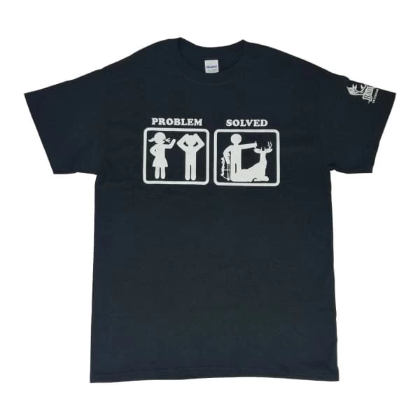 Problem Solved black t-shirt with small white Badass Outdoor Gear logo placed as locker tag. This tshirt includes a drawing of a female yelling at man and a man going bow hunting with success!