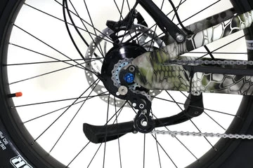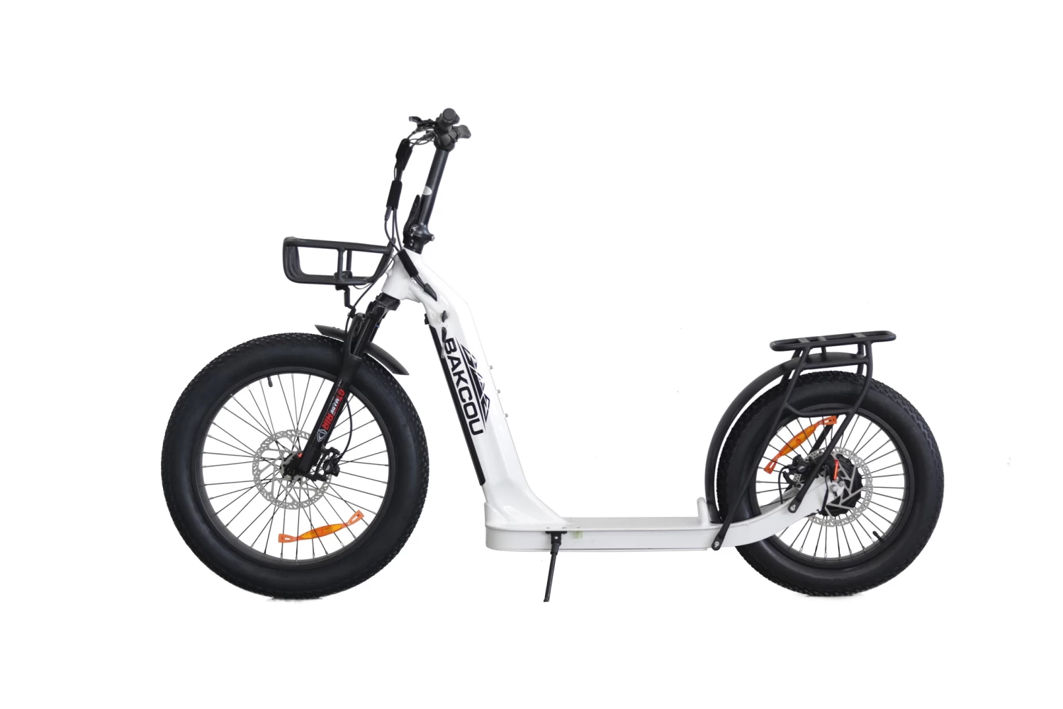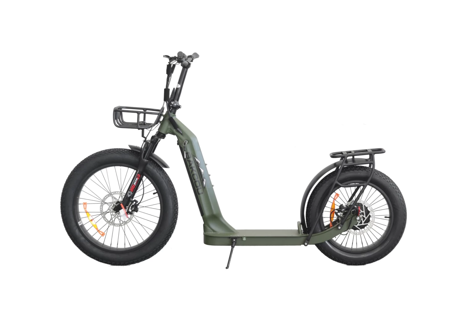 The Timberwolf is fully-equipped with Tektro dual-piston brakes in the front and rear, 400 Lumen Headlight, a Rear Pannier Rack, and Front and Rear Mud Fenders. The 24-inch front tire makes climbing over rocky terrain a breeze. Foldable handlebars make hauling this scooter to the mountains a breeze, and the kickstand helps keep it upright.ย