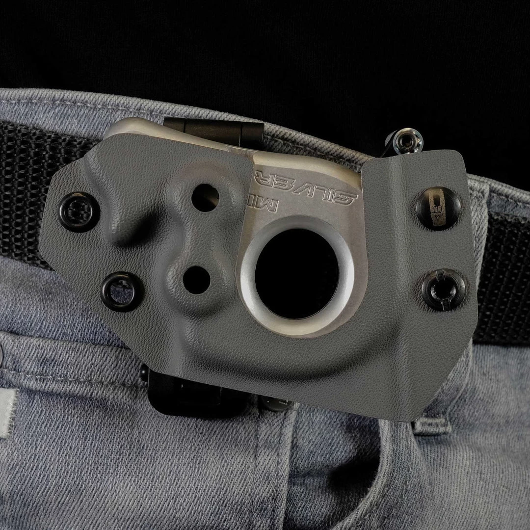 TO ADJUST for the Mini Nock 2 It and Mini Silverback PLUS simply load the release and shift it tightly to the ring finger side of the release. Once positioned flush left in the holster, use an allen wrench to turn the lever arm set screw clockwise to shift the adjustment tighter against the release casing to close the gap and secure the “mini” versions of the releases. Once the adjustment is made, you can slightly modify the tightness you prefer for the Custom Release Holster.