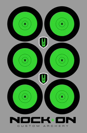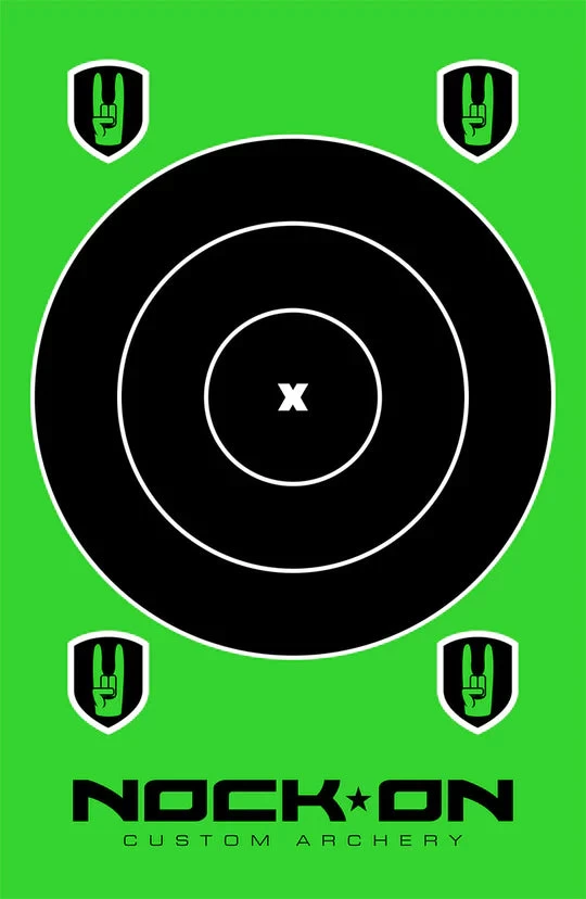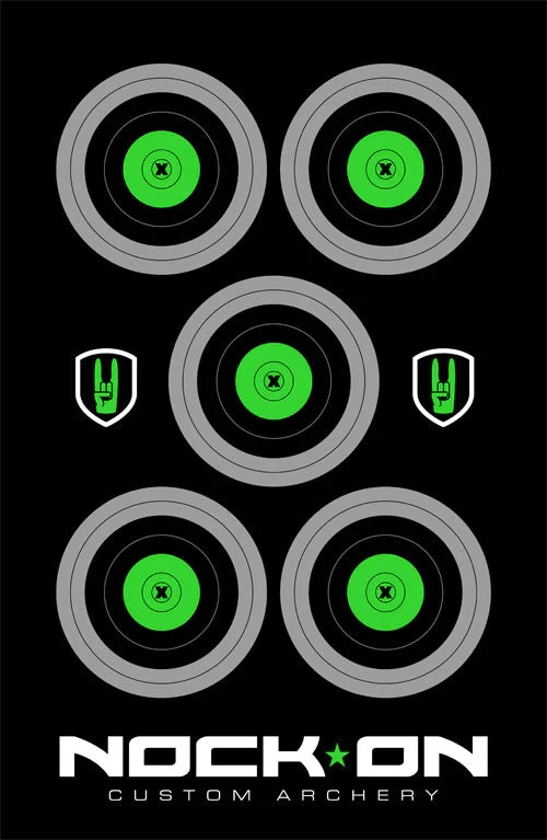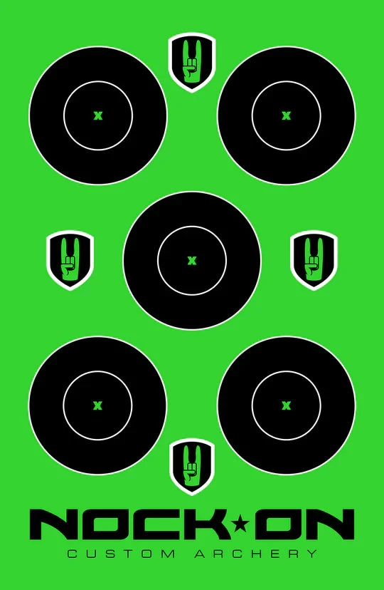 This target design is customized for learning the tension activated releases and the natural float of your sight pin when learn a dynamic shot. This high contrast green outer ring teaches the archer to embrace the movement within the inner black center while continuing to pull through the shot. The concept is to treat the green ring as you would the white lines on a road when driving. You allow the pin movement within the lines and continue to pull through the shot but as you near the line ease the pin back into the middle just like you would steer a car between the lanes. The drill is to Visualize moving the sight pin within the large green ring and being comfortable with that movement and watch how the groups naturally tighten up as you embrace the float. This target is also awesome for mid to long range visibility.