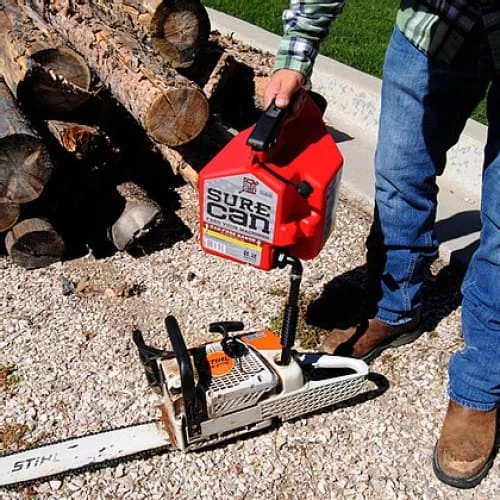 The flexible spout rotates down more than 180 degrees and fits perfectly into any machines fill location while the thumb release trigger on top controls the flow. By pulling straight back on the safety trigger and then down on the thumb button fuel is released immediately while you stay in complete control the entire time. When you notice your fill tank is almost full slowly release the thumb button and allow the excess fuel to drain from the top of the spout before rotating it back up. No more bending over and tipping your fuel can forward and holding it in an awkward position! The SureCan is a high quality fuel dispensing machine!